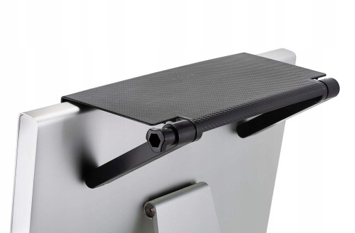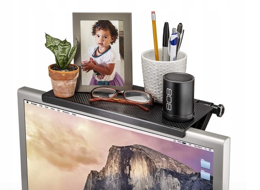 Półkę można zamontować na każdym monitorze lub telewizorze z płaskim ekranem. Dzięki regulowanym podpórkom nie potrzebujesz narzędzi do instalacji. Wystarczy położyć na górnej części ekranu, wyregulować podpórki i zablokować dokręcając pokrętło.
