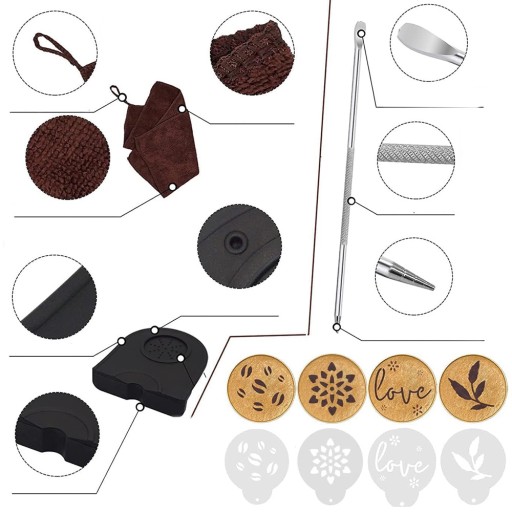 ☕Akcesoria do kawy: dzbanek na mleko (350 ml) wykonany ze stali nierdzewnej ma wewnątrz skalę, jest wytrzymały, odporny na rdzę i można go myć w zmywarce. Silikonowa mata do tampera zapobiega ślizganiu się portafiltra podczas ubijania i chroni blaty i portafiltry przed uszkodzeniem. Profesjonalny pisak do latte art tworzy piękne kawowe wzory. Szablony dekoracyjne oferują szeroką gamę motywów i są wykonane z wystarczająco wytrzymałego tworzywa sztucznego.