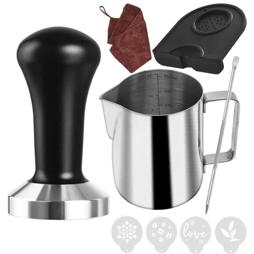 ☕Zestaw tampera 51 mm: pojedyncze opakowanie zawiera tamper 51 mm, dzbanek na mleko 350 ml, 4 szablony dekoracyjne, 1 matę do tampera, 1 pisak latte art i 1 ściereczkę z mikrofibry.