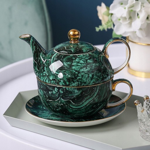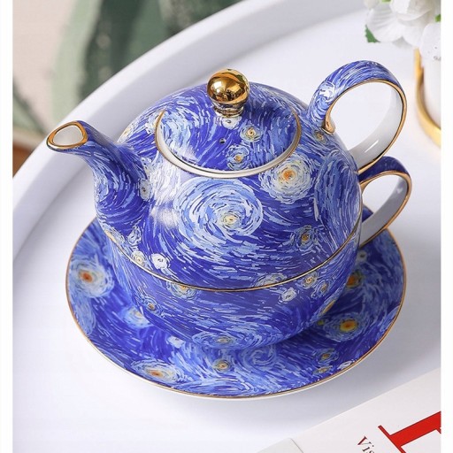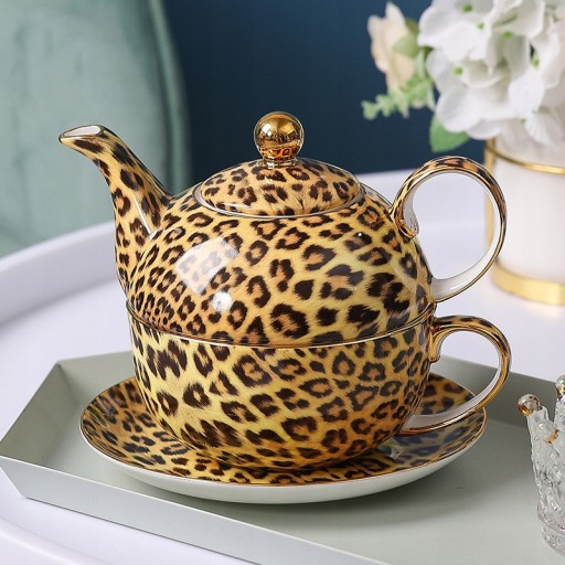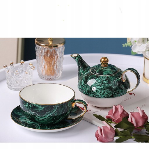 Rozmiar: wysokość czajniczka 8cm, średnica 6cm, wysokość filiżanki 6cm, średnica 12cm, wysokość spodka 2cm, średnica 17,5cm