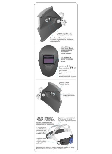 Przyłbica spawalnicza z filtrem samo-ściemniającym. Klasa optyczna 1/2/1/3. Wysokiej jakości filtr wyposażony w 4 sensory łuku zapewnia pole widzenia 98*43mm, stan ciemny DIN 9-13, stan jasny DIN4, czas reakcji 1/25000s, czas rozjaśniania 0,1-1,0s a czas zaciemniania 0,3-0,8ms. Ponadto filtr zapewnia ochronę przeciw promieniom UV/IR na poziomie DIN16.