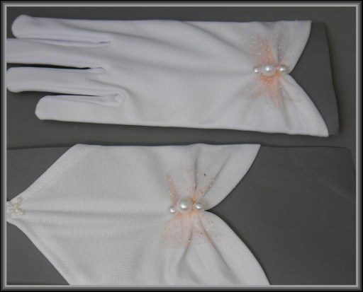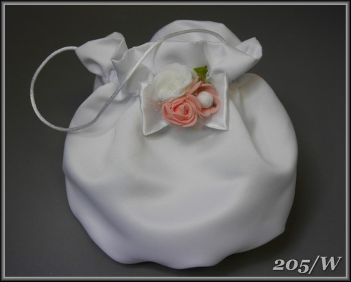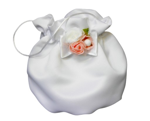 Torebka komunijna w kształcie woreczka z satyny ślubnej z usztywnianą wkładką pomagającą zachować kształt woreczka nawet po jego obciążeniu. Do torebki na pozostałych aukcjach można dopasować: rękawiczki, okapnik, a nawet wianek. Produkt Polski.