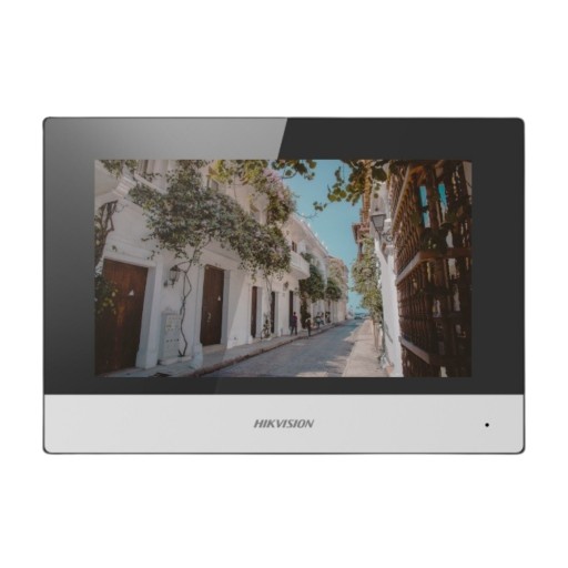 Zestaw korzysta ze stacji DS-KAB8103-IMEX, który posiada 2Mp kamerę z obiektywem typu fisheye i podświetleniem IR. Widok z DS-KAB8103-IMEX jest wyświetlany na 7″ ekranie stacji wewnętrznej. DS-KH6320-WTPE2, z którego można zarządzać oprogramowaniem. Ekran wyświetla obraz w rozdzielczości 1024×600 pikseli.