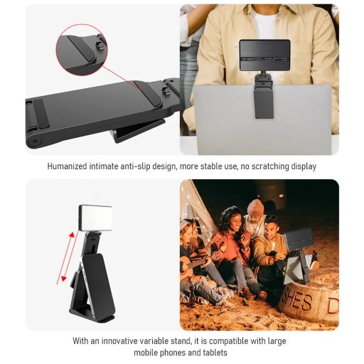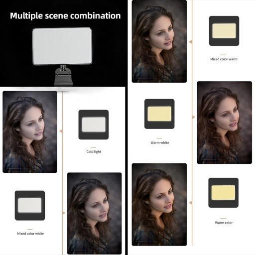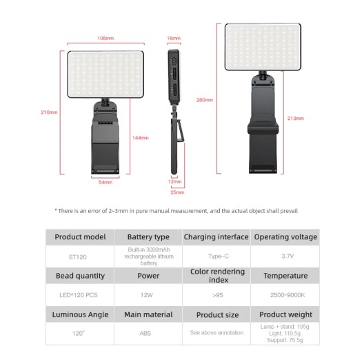 🌷Dane techniczne: 🌷Materiał: ABS 🌷Koraliki LED: 120 sztuk 🌷Temperatura barwowa: 2500K-9000K 🌷Moc: 12W 🌷Napięcie robocze: 3,7V 🌷CRI: 95 #43; 🌷Kąt świecenia: 120° 🌷Pojemność baterii: 3000 mAh 🌷Rozmiar elementu: 10,6 * 6,6 * 1,6 cm/ 4,2 * 2,6 * 0,6 cala 🌷Waga elementu: 117 g/ 4,1 uncji (bez klipsa) 🌷Lista pakowania: 🌷1 * Lampa wideo LED 🌷1 * Kabel USB 🌷1 * Podstawka oświetleniowa 🌷1 * Instrukcja obsługi (angielski, chiński)