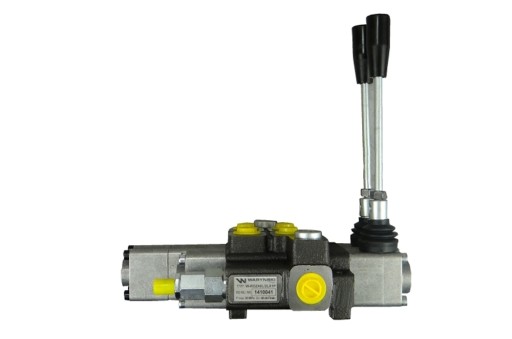 Rozdzielacz hydrauliczny 2-sekcyjny Waryński - monoblokowy z układem równoległym z neutralną pozycją środkową sterowany za pomocą 2 dźwigni. Jedna sekcja: pływająca (z zatrzaskiem).