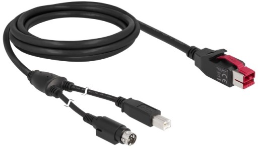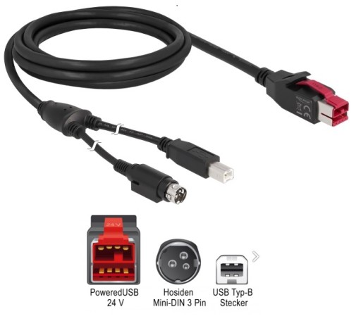 Kabel PoweredUSB do podłączenia urządzenia z gniazdem USB Typ-B oraz gniazdem zasilania Hosiden Mini-DIN 3 pin do komputera PC lub koncentratora z gniazdem PoweredUSB 24 V. Przeznaczony do podłączania różnych urządzeń POS, takich jak drukarki i terminale, np. Epson,Toshiba lub Fujitsu. Kabel jest używany zarówno do transmisji danych, jak i zasilania podłączonych urządzeń.