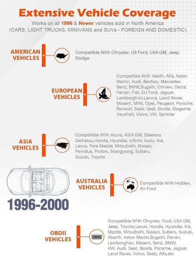 Protokoły OBDII i kompatybilność z samochodami: Wiele tanich narzędzi do skanowania tak naprawdę nie obsługuje wszystkich protokołów OBD2. Nie dotyczy to skanera AD310, ponieważ może on obsługiwać wszystkie protokoły OBDII, takie jak KWP2000, J1850 VPW, ISO9141, J1850 PWM i CAN. To urządzenie ma również szeroką kompatybilność z pojazdami z 1996 r. w USA, 2000 w UE i w Azji, lekkimi ciężarówkami, SUV-ami, a także nowszymi pojazdami OBD2 i CAN, zarówno krajowymi, jak i zagranicznymi. Przed zakupem sprawdź kompatybilność z modelem pojazdu.