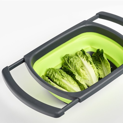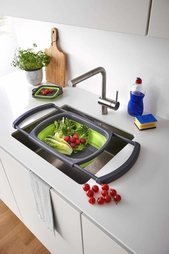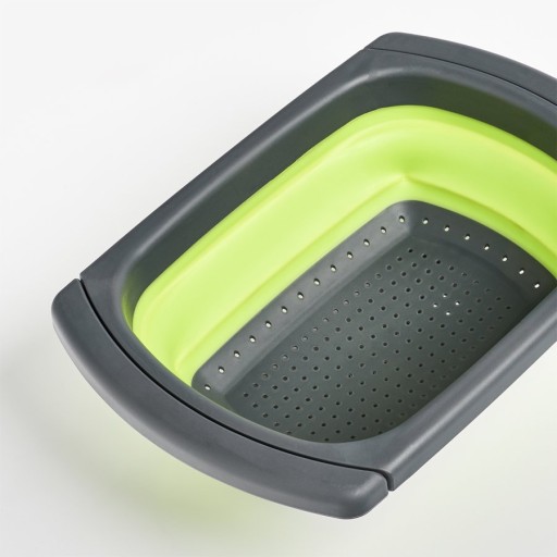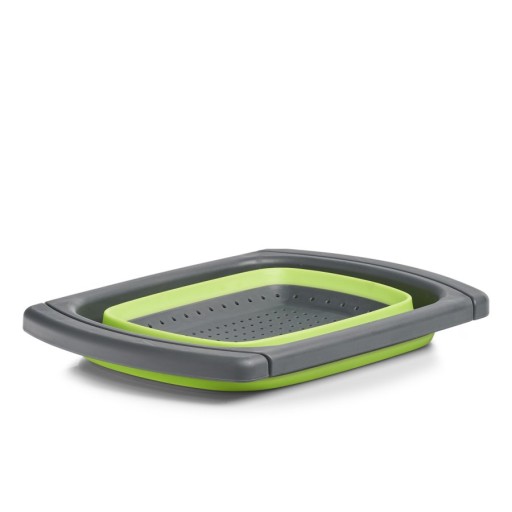 Składane sito jest idealne do kuchni z małą ilością miejsca. Po użyciu można złożyć na płasko i schować na niewielkiej przestrzeni. Zielona, regulowana część z tworzywa sztucznego umożliwia korzystanie z sita na dwóch różnych wysokościach. Pomocnika kuchennego można również umieścić w zmywarce do czyszczenia.