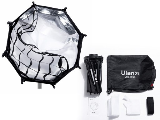 Oktagonalny softbox Ulanzi AS-D30 o średnicy 30 cm to kompaktowych rozmiarów modyfikator światła przeznaczony do lampy LED LT028 40 W i wykorzystujący mocowanie Mini Bowens. W komplecie z czaszą znajdują się dwa dyfuzory – wewnętrzny i zewnętrzny – oraz grid. Całość przechowywana jest w solidnym futerale.