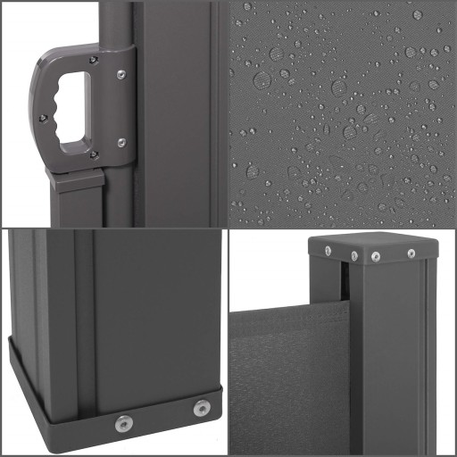 Część materiałowa wykonana została z mocnej poliestrowej tkaniny z powłoką poliuretanową o gramaturze 180 GSM, odpornej na niekorzystne warunki pogodowe, słońce lub deszcz. Ponadto materiał markizy jest gruby i nie prześwitujący, co zapewnia całkowitą prywatność.