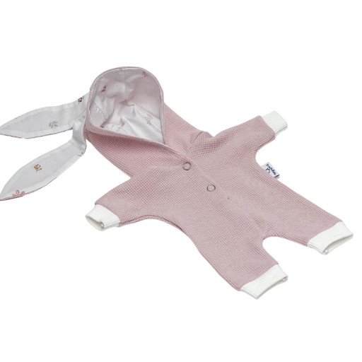 Kombinezon posiada obszerny kaptur do, którego wszyto uszy zajączka/króliczka. Kaptur i uszy podszyte zostały bawełną o delikatnym roślinnym wzorze.