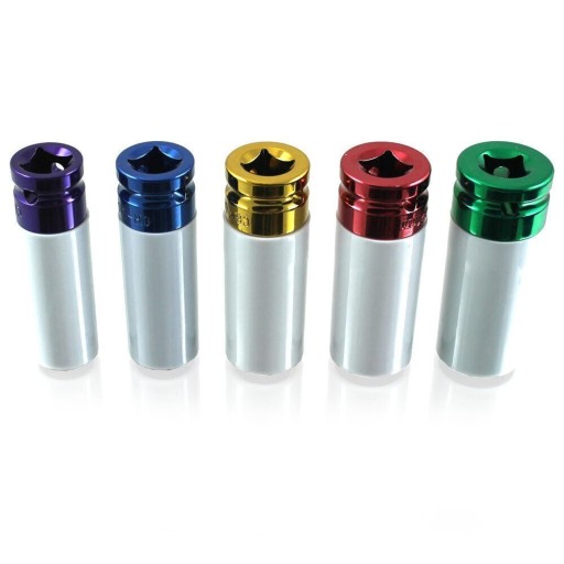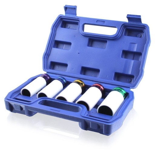5-częściowy zestaw nasadek udarowych 1/2" wykonany z wysokiej jakości stali chromowo-molibdenowej. Nakrętki udarowe posiadają zabezpieczenie obręczy, które można również zdjąć. Idealny do wymiany kół bez uszkadzania felg.