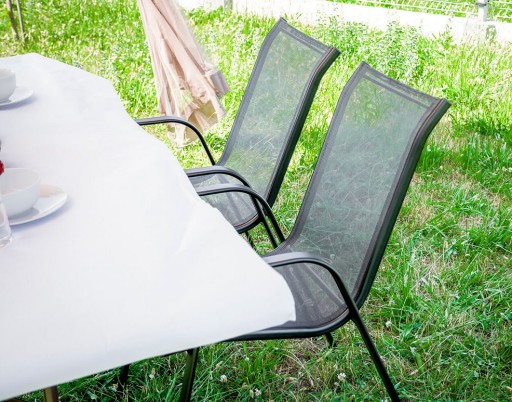 4x Krzesła ogrodowe od firmy RahheGarden zostały wykonane z najlepszych jakościowo materiałów uzyskując tym dużą wytrzymałość oraz bardzo dobre wykonanie produktu. Nowoczesny i elegancki design sprawi, że doskonale będą komponować się z istniejącą aranżacją ogrodu. Nasze krzesła sprawdzą się na balkonie, tarasie i w ogrodzie. Stelaż został podwójnie lakierowany proszkowo, co idealnie przystosowuje ten produkt do zastosowania wewnątrz jak i na zewnątrz. Siedzisko krzesła oraz oparcie zostało zrobione z czarnego, elastycznego obicia tekstylnego tak, aby maksymalnie zwiększyć wygodę. Krzesła posiadają dwa podłokietniki. Użyte materiały nie wymagają konserwacji, są odporne na warunki pogodowe i nie wymagają specjalnych środków do pielęgnacji. Nóżki są dodatkowo zaopatrzone w nakładki z tworzywa sztucznego