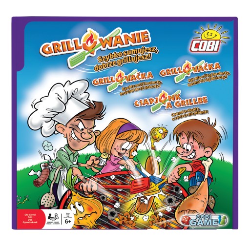 Gra rodzinna Cobi Grillowanie to wspaniała rozrywka dla całej rodziny, która rozwija refleks i ćwiczy szybkie liczenie. Gra przeznaczona jest dla 2-4 graczy i jest wesołą propozycją na popołudnie. Rozgrywka polega na rzucaniu kostkami. Po wyrzuceniu określonej liczby oczek, gracz zabiera przy pomocy łopatki jedzonko, które odpowiada liczbie z wyrzuconych wcześniej kostek. Celem gry jest zebranie 6 kart z jedzeniem, w jak najkrótszym czasie. Kto zostanie zwycięzcą? Ten kto ma najlepszy refleks i kto najszybciej liczy. Na kostkach możesz znaleźć dodatkowe symbole: ŻART i WYMIANA. Postępuj zgodnie z zasadami gry. Możesz także zagrać w wersję dla zaawansowanych.