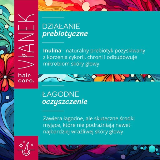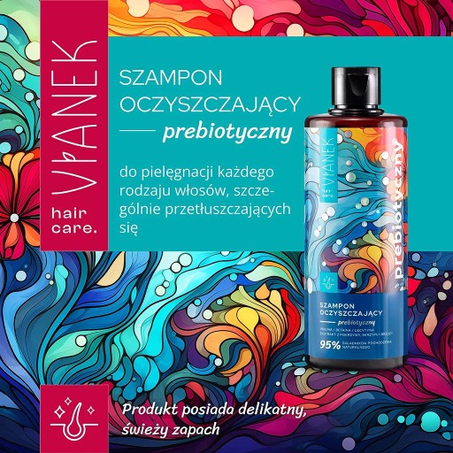 VIANEK Prebiotyczny szampon oczyszczający został stworzony, aby zapewnić Twoim włosom dokładne oczyszczenie, jednocześnie dbając o skórę głowy. Dzięki starannie dobranym składnikom aktywnym, szampon odżywia skórę, przywracając jej naturalną równowagę.Szampon oparty jest na mocniejszym detergencie anionowym Sodium Coco-Sulfate, który łagodzony jest przez delikatne działanie Cocamidopropyl Betaine oraz Coco Glucoside.Nawilżenie skórze głowy zapewnią gliceryna i pantenol, które pomagają zatrzymać wodę w skórze głowy. Głównym składnikiem aktywnym jest inulina, naturalny prebiotyk, który wspiera równowagę mikroflory skóry głowy, wzmacniając jej barierę ochronną.Dodatkowo szampon będzie działał regulująco w kierunku nadprodukcji sebum dzięki zawartości ekstraktów z pokrzywy, skrzypu i brzozy.Dzięki naturalnym ekstraktom roślinnym szampon nie tylko efektywnie oczyszcza, ale także pielęgnuje włosy i skórę głowy, zapobiegając ich przesuszeniu i wspierając naturalne procesy regeneracji mikrobioty skóry głowy.