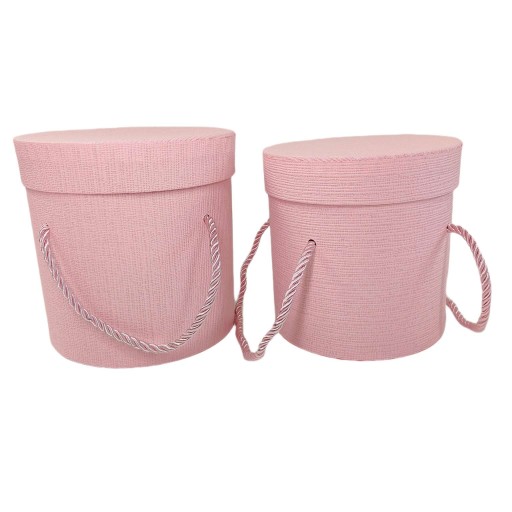 Pudełka wykonane z twardego kartonu, okrągłe w kolorze różowym.