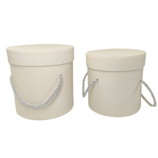 Pudełka wykonane z twardego kartonu, okrągłe w kolorze kremowym.
