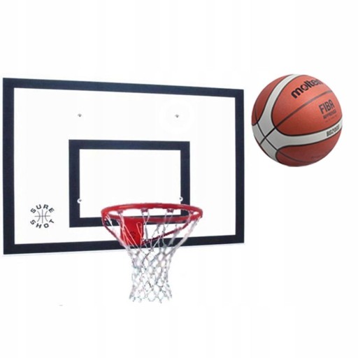Zestaw do koszykówki SURE SHOT W skład zestawu wchodzi: • tablica • obręcz stała • siatka. Tablica o wymiarach 120 x 90 cm wykonana z polipropylenu odporna na warunki atmosferyczne. Średnica kosza 45 cm Obręcz stała EURO STANDARD wykonana z pręta stalowego o średnicy 17 mm, podpory obręczy wykonane z pręta stalowego o średnicy 13 mm. Siatka sznurkowa na 12 zaczepów.