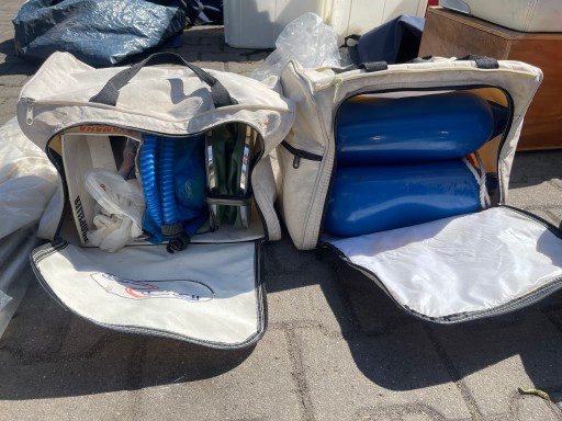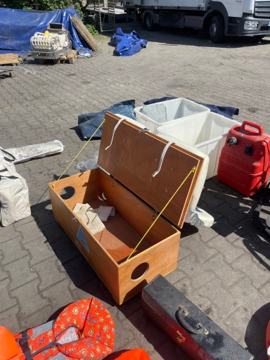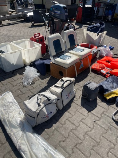 Układ kierowniczy ALLPA, aluminiowa podłoga do pontonu, zbiornik paliwa 25 litrów, podwójne siedzisko, linki, bojki, kamizelki ratunkowe i inne widoczne na zdjęciach.