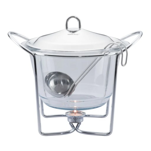 Pojemność: 4.10L Naczynie wykonane jest ze szkła żaroodpornego. Zastosowane szkło żaroodporne jest przeznaczone do pracy w zakresie temperatur -25° / +260°. W zestawie łyżka wazowa. Stal nierdzewna chromowana o najwyższym poziomie połysku oraz polerowane uchwyty. Uniwersalność tego naczynia polega na tym że prosto z kuchenki można go postawić na stole na będącym w komplecie stojaku ze świeczkami dzięki czemu nasza potrawa cały czas utrzymuje ciepło. Wszystkie części kompletu można myć oddzielnie, co pozwala w łatwy sposób utrzymać go w należytej czystości . Nadaje się do mycia w zmywarkach. Komplet wyjątkowo ładnie prezentuje się na stole, zaufaj renomowanej firmie!