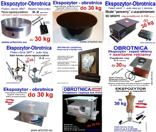 WYKONUJEMY I WYSTAWIAMY NA ALLEGRO URZĄDZENIA NA ZAMÓWIENIE np ekspozytory - obrotnice z napędem,o obciążeniu do 5, 8, 12, 20, 30, 60, 120, 150, 200 , 300 kg i większe, dowolne kształty, prędkości,wymiary, kolory, dodatkowe funkcje, wersje z niepełnym obrotem - ruch wahadłowy, funkcją zatrzymania co np 10 stopni, złącza umożliwiające podłączenie do sieci 230 v lub 12 v obracające się urządzenie bez obawy ukręcenia przewodów, mechanizmy napędu dużych reklam, mechanizmy zarówno obrotowe jak i liniowe a także mini wyciągarki reklamowe podnoszące reklamy nad wystawą, obrotnice wiszące-sufitowe, sterowniki czasowe, czujniki ruchu, piloty bezprzewodowe,mechanizmy ożywiające witryny sklepowe i wystawowe.