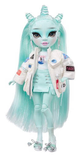 WYRAŹ SWÓJ WŁASNY STYL: Zooey Electra jest jasnozielona od stóp do głów. Wyraża swój własny styl w białej kurtce z zabawnymi naszywkami, zielonej spódnicy z klamrami w kolorze morskiej piany, uroczej koszulce z nadrukiem, sandałach na koturnie, zielonych skarpetkach i zabawnych dodatkach. I ma piękne zielone proste długie włosy z 3 skręconymi kokami, długie prawdziwe rzęsy i szklane oczy.