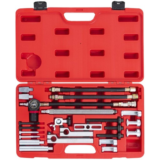 Ściągacz sprężyn zaworowych marki MSW to idealne narzędzie do montażu i demontażu sprężyn zaworowych i uszczelek trzpieni. Zestaw składający się z 24 elementów zawiera wszystko, co jest niezbędne do wymiany. Dzięki uniwersalnemu obszarowi zastosowania ściągacz do sprężyn jest idealny do warsztatów samochodowych jak i dla pasjonatów motoryzacji do prywatnego wyposażenia. Ściągacz do sprężyn może być używany w wielu typach samochodów, takich jak Mercedes-Benz, BMW, Toyota, Ford, Mitsubishi, VAG i innych. Nadaje się szczególnie do silników BMW N20, N26 i N55. Jeśli uszczelka trzonka zaworu zostanie wymieniona pneumatycznie, ciśnienie w cylindrze zostanie podane za pomocą odpowiedniego adaptera. Podczas tego procesu zapobiega się cofaniu zastawki, co nie tylko znacznie ułatwia pracę, ale także umożliwia łatwą wymianę zasuw głęboko osadzonych. Praktyczną cechą ściągacza jest to, że głowica cylindra nie musi być specjalnie zdejmowana. Zestaw narzędzi sprawdzi się również w ciasnych przestrzeniach. Komplet wykonano z wysokiej jakości i wytrzymałej stali, co gwarantuje długą żywotność. W praktycznej walizce wszystkie przybory są bezpiecznie i przejrzyście przechowywane. Można je łatwo schować, gdy nie są używane.