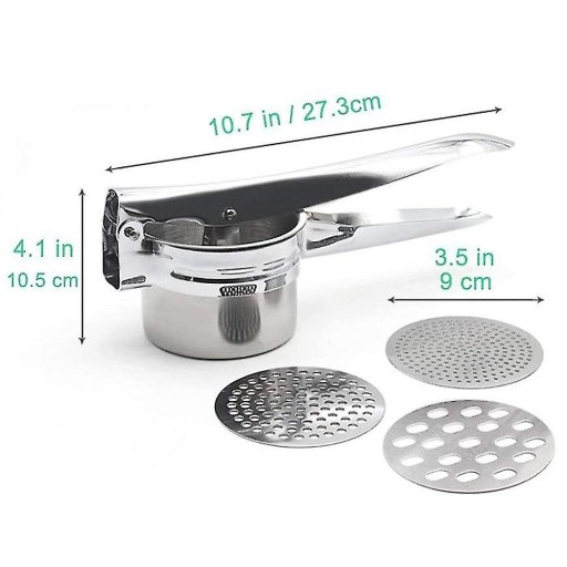 Materiał: Powłoka uchwytu, stal nierdzewna 430, Rozmiar: Długość uchwytu 27 cm; Wysokość filiżanki 6,8 cm; Całkowita wysokość 9 cm; Średnica podstawy 9 cm; Średnica powierzchni prasy 8 cm. Kolor srebrny, Pakiet zawiera: 1 x prasa do ziemniaków, 3 * wymienne, tarcze WKŁADY FILTRUJĄCE DO WKŁADANIA: Nasze wkładki sitowe mogą być używane w zależności od sytuacji. Dzięki 3 perforowanym tarczom może być używana jako prasa do ziemniaków, prasa szpatułkowa, prasa do owoców, prasa do soków, prasa do warzyw i prasa do puree. Bardzo twarde substancje (np. ziemniaki) powinny być gotowane WYSOKIEJ JAKOŚCI STAL NIERDZEWNA: Garnek wyciskarki do ziemniaków wykonany jest z wysokiej jakości stali nierdzewnej 304, jest nierdzewny, można go myć w zmywarce & amp; bardzo stabilny. Ponadto multi-press przekonuje pierwszorzędnym wykonaniem i wykończeniem. NIERDZEWNA: Prasa do ziemniaków (znana również jako tłuczek do ziemniaków) jest bardzo łatwa do czyszczenia po użyciu, ponieważ można ją myć w zmywarce i jest wolna od rdzy. Wystarczy zdjąć silikonowe podkładki pod nadgarstki i włożyć prasę do zmywarki.