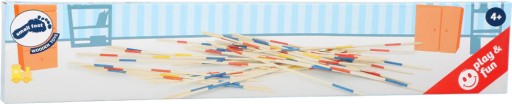 Zestaw zawiera czterdzieści jeden drewnianych bierek, oznaczonych różnymi kolorami, najwyżej punktują te patyczki, których malowanie występuje w najmniejszej ilości. Doskonała zabawa zarówno w domu jak i na podwórku, która ćwiczy koncentrację, cierpliwość oraz zręczność od najmłodszych lat.