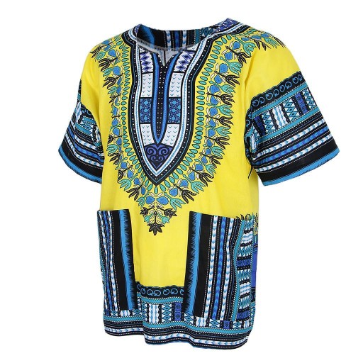 Unisex Z Afrykańskimi Nadrukami Bawełniana Koszula Dashiki Etniczny Kaftan Żółty Niebieski
