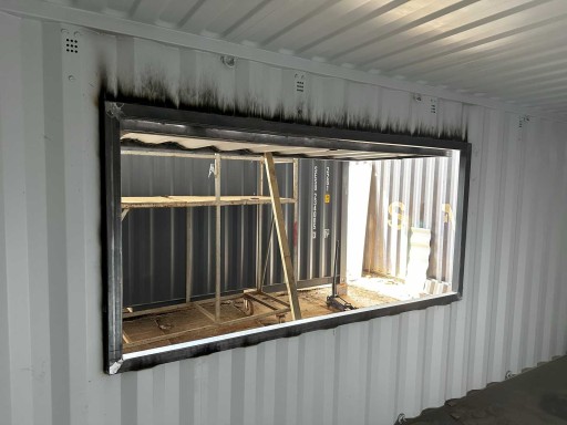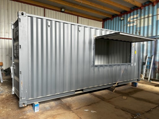 Kontener gastronomiczno-handlowy o powierzchni 15 m2 wykonanay na bazie kontenera morskiego 20 DV , wyposażony w pneumatyczne siłowniki do podnoszenia ścian bocznych