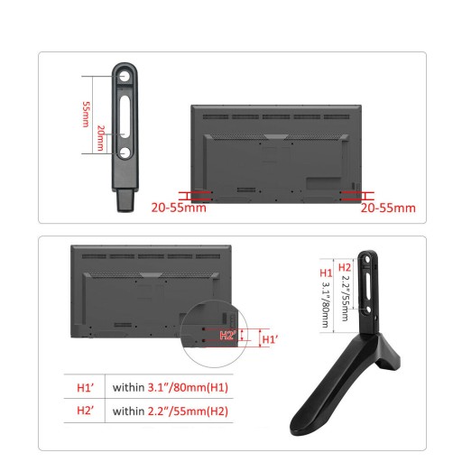 ✅ Wspornik można zainstalować na dwa sposoby, wewnętrzny i zewnętrzny wspornik podstawy telewizora.Kupując stojak, sprawdź telewizor, czy otwory montażowe z tyłu znajdują się na dole telewizora i zmierz odległość między otworami.Uchwyt pasuje do telewizora każdej marki o rozstawie 20-55mm pomiędzy otworami montażowymi pod telewizor i wadze 45kg.