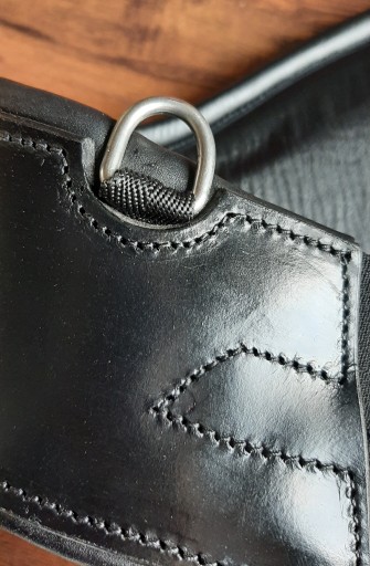 Z wysokiej jakości skóry naturalnej, o anatomicznym kształcie- szeroka powierzchnia styku w obszarze mięśnia piersiowego optymalizuje rozkład nacisku, a zwężenie w okolicy łokcia zapewnia maksymalną swobodę ruchu i zapobiega obtarciom. Posiada gumy po obu stronach.