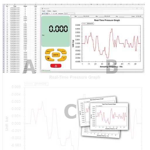 Dedykowana aplikacja Manometer, umożliwia odczyt danych z urządzenia bezpośrednio w programie. Po podłączeniu urządzenia za pomocą przewodu USB do komputera dane są rejestrowane bezpośrednio w programie.