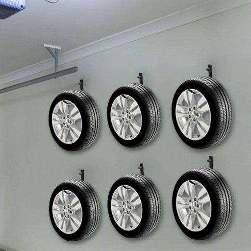 Uchwyt montażowy na opony do idealnego rozwiązania do porządnego przechowywania i oszczędzania miejsca w garażu. Bagażnik, w którym można zastosować opony zimowe lub letnie, można bez problemu zamocować na ścianie.
