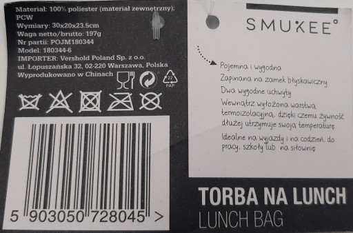 Firma Smukee przedstawia pojemną i wygodną torbę termiczną. Posiada zamek błyskawiczny, który pozwala na łatwe otwieranie i zamykanie torby. Torba posiada dodatkowo dwa wygodne uchwyty, które ułatwiają przenoszenie. Środek został wyłożony warstwą termoizolacyjną, dzięki której żywność utrzymuje swoją temperaturę przez dłuższy czas.