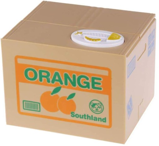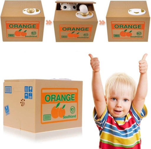 Zabawny kotek chowający się w skrzyni na owoce zachęci Twoje dziecko do odkładania swoich pieniążków.
