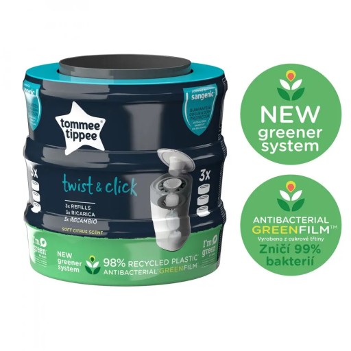 Wkłady do pojemnika na pieluszki Tommee Tippee Twist&Click to doskonałe rozwiązanie dla każdego rodzica, który pragnie utrzymać czystość i świeżość w domu. Rewolucyjna, wielowarstwowa folia antybakteryjna nie tylko skutecznie blokuje nieprzyjemne zapachy i zarazki, ale również jest bardzo prosta w użyciu — wystarczy włożyć wkład do pojemnika. Zastosowana technologia Twists & Locks zabezpiecza przed bakteriami i zapachami, zapewniając ochronę antybakteryjną na poziomie 99%. Każdy wkład może pomieścić do 30 pieluszek, co znacząco redukuje konieczność częstego wynoszenia śmieci.