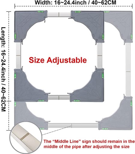 Regulowany rozmiar: szerokość / długość 40 ~ 61 cm, wysokość 10-12,5cm,. W zależności od szerokości pralki/suszarki/lodówki można dokonać regulacji pionowych i poziomych.