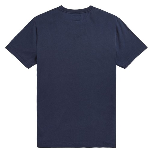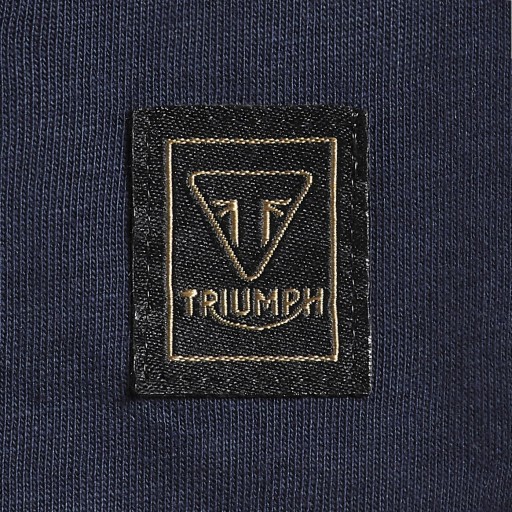 Klasyczna bawełniana koszulka w kolorze niebieskim z logo Triumph z miękkim pigmentem i trójkątną plakietką w kolorze Dull Gold z przodu.