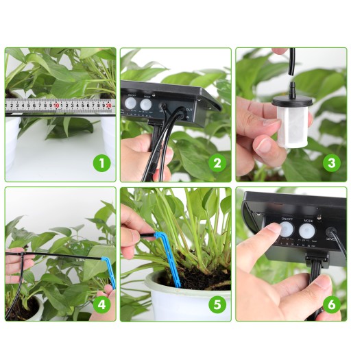 Automatyczny tryb czasowy systemu nawadniania słonecznego, regulowane 6 trybów timera, czas nawadniania wynosi 5/15/20 minut, częstotliwość nawadniania wynosi 12/24 godziny. W porównaniu z konwencjonalnym nawadnianiem kropelkowym, pozwala to zaoszczędzić co najmniej 70% wody, wybrać liczbę kropel i częstotliwość nawadniania zgodnie z zapotrzebowaniem na wodę.