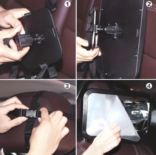 Montaż lusterka to czysta wygoda. Za pomocą czterech pasków, zarówno w pionie, jak i poziomie, zapewnisz stabilne przytwierdzenie do zagłówka. Dodatkowo, obrót o 360 stopni pozwala na idealne ustawienie lusterka, bez względu na wzrost osoby kierującej.