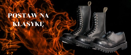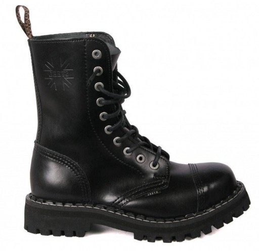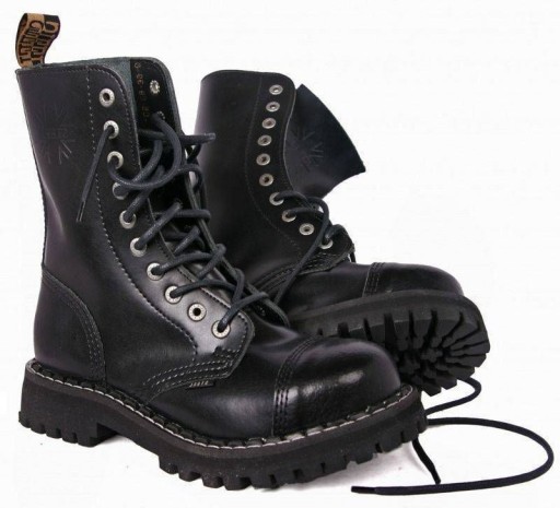 Model znanej europejskiej marki STEEL. Jest to bestseller wśród glanów. Prezentowany model buta to klasyczny GLAN 10-dziurowy w kolorze CZARNYM (black). Wykonany ze skóry naturalnej z metalowym noskiem na standardowej czarnej gumowej podeszwie z wkrętami.
