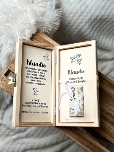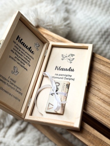 Personalizowane pudełko na Komunię Świętą, do którego można włożyć pieniądze i zawinąć wstążką. Będzie to wyjątkowy prezent, zastępujący papierową kartkę oraz pamiątka na długie lata! Pudełeczko zamykane jest na złote zapięcie.