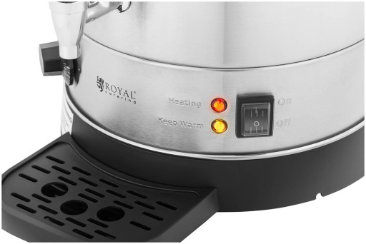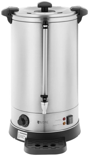 Warnik marki Royal Catering pozwala podgrzewać oraz utrzymywać w cieple napoje. Duża pojemność 19,7 l nadaje się do obsługi wielu osób w hotelach, stołówkach, na targach, festiwalach czy jarmarkach. Warnik wykonany został z wytrzymałej stali nierdzewnej, łatwej w pielęgnacji i nie wchodzącej w reakcje z żywnością. Duża moc 2500 W pozwala szybko podgrzać napoje do temperatury 30-110°C. Dzięki funkcji utrzymywania ciepła zawartość warnika jest zawsze gotowa do spożycia. Dwie lampki kontrolne pokazują stan funkcji ogrzewania lub utrzymywania ciepła. Wskaźnik poziomu płynu pozwala kontrolować jego uzupełnianie. Dwuścienna konstrukcja za sprawą izolacji jest szczególnie energooszczędna. Kranik pozwala dokładnie odmierzać porcje napoju a tacka ociekowa chroni przed rozlaniem.