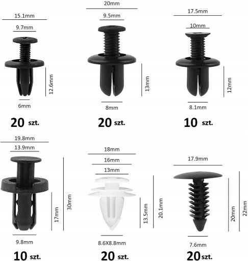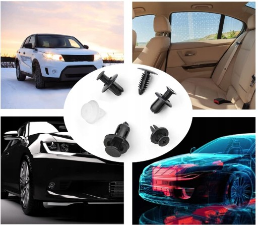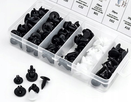 Zestaw kompatybilny z różnymi typami pojazdów, pozwala na mocowanie różnych elementów w samochodzie. W skład zestawu wchodzą różnego rodzaju elementy mocujące takie jak spinek, kołków, które pozwolą na przymocowanie tapicerki, elementów plastikowych, zderzaków w pojeździe.
