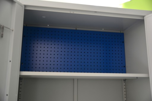 - Ukrytą wewnątrz tablicę perforowaną umożliwiającą zawieszenie haczyków czy też narzędzi przy pomocy bolców