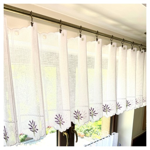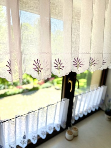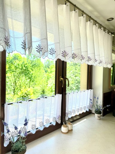 Przedmiotem sprzedaży jest biała firanka typu zazdrostka . Tkanina do złudzenia przypomina naturalny len ozdobiona haftem bukiecików lawendy w odcieniach fioletu a gałązki w kolorze zieleni , takie zestawienie obłędnie wygląda w oknie. .