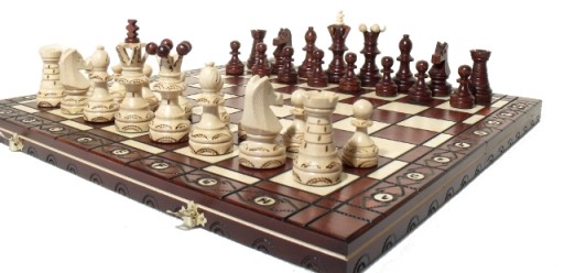 Figury szachowe są elegancko wykończone ozdobnie opalane. Szachownica również prezentuje się pięknie!