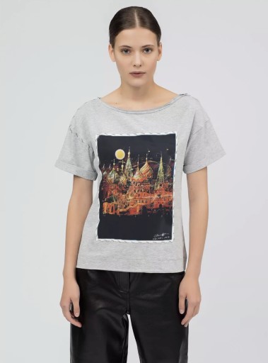 -shirt z autorskim nadrukiem na piersi wyróżni Twoją garderobę spośród innych. Nadruk jest drukowany na jedwabnej tkaninie i naszywany na T-shirt. Asymetryczny dekolt, surowy dół i luźny krój pozwolą Ci wykorzystać T-shirt w różnorodnych stylizacjach: od codziennych po wieczorowe.